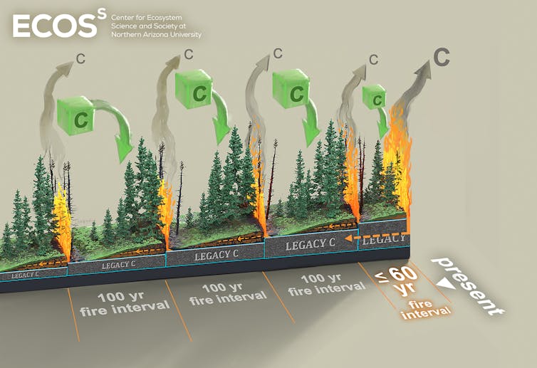 However, our work in the Northwest Territories shows that when young forests (less than 60 years old) burn, this old carbon — stored in previous fire cycles — is closer to the surface, making it about five times more likely to burn. Increasing fire frequency thus makes boreal forests more likely to release stored legacy carbon back to the atmosphere.