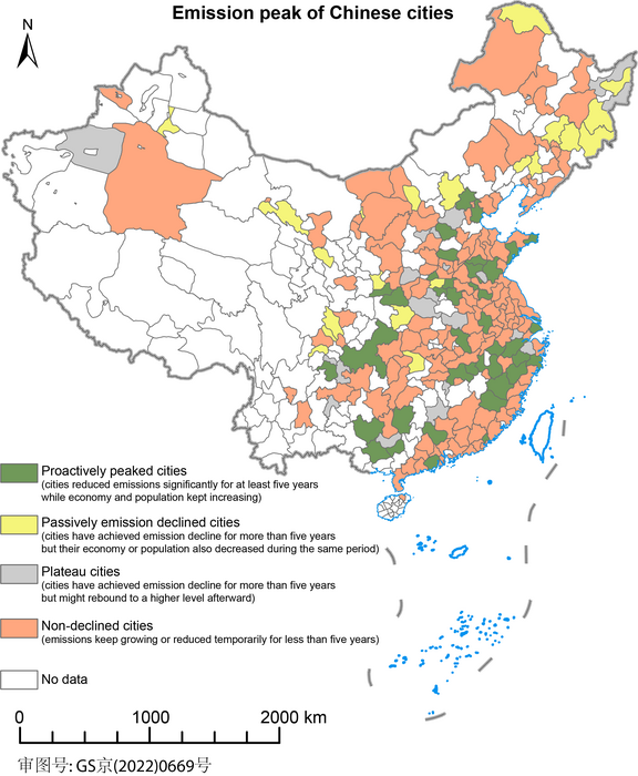 Based on the long time-series city-level emission data, Dr Shan and his colleagues tested the status of the emissions peak in 287 Chinese cities based on several conditional functions, the Mann-Kendall (MK) trend test, and cities’ decoupling of emissions and social development indexes (e.g., level of economic development and size of the population). The MK trend test is a nonparametric statistical method recommended by the World Meteorological Organization (WMO) and has been widely used to detect time-series trends of climate sequences.