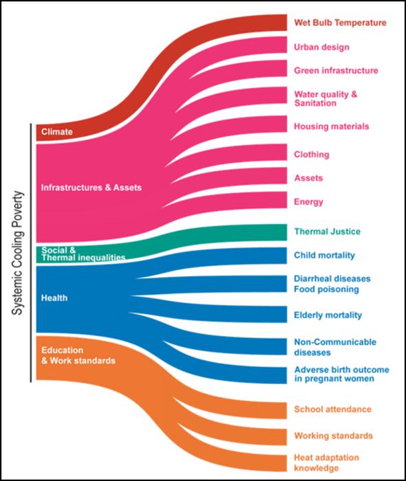 Cooling poverty can be defined as systemic because it develops in a context in which organisations, households, and individuals are exposed to the detrimental effects of increasing heat stress mainly because of inadequate infrastructures. Such infrastructures include physical assets (such as passive retrofit solutions, cold chains, or personal technological cooling devices), social systems (as networks of support and social infrastructures), and intangible resources (such as knowledge, to intuitively adapt to the combined effects of heat and humidity).