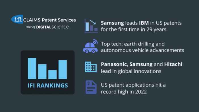 These are among the findings by IFI CLAIMS Patent Services, a Digital Science company which compiles and tracks data from the U.S. Patent and Trademark Office (USPTO) and other patent-issuing agencies around the globe. The data can be found in the newly published 2022 U.S. Top 50 and IFI Global 250 patent rankings.