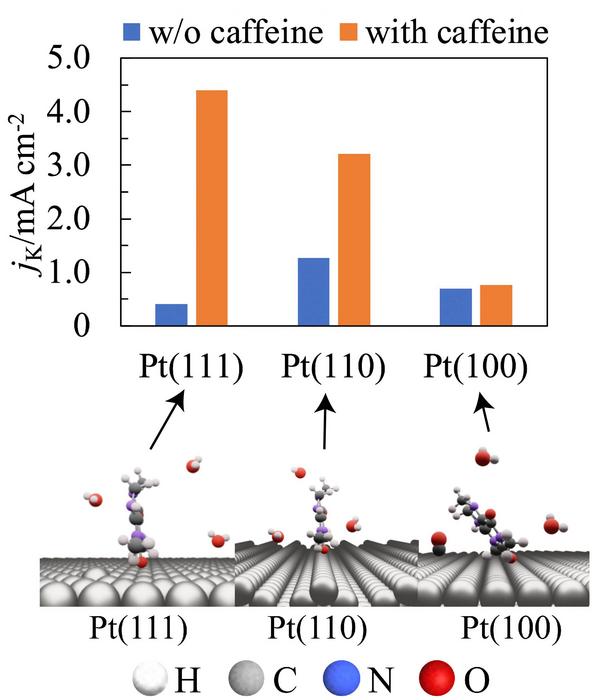 “The increased ORR activity of Pt(111) and Pt(110) was attributed to the decreased PtOH coverage and lower steric hindrance of the adsorbed caffeine. Conversely, for Pt(100), the effect of decreasing PtOH was counteracted by the steric hindrance of the adsorbed caffeine, and thus caffeine did not affect the ORR activity,” explains Prof. Hoshi.